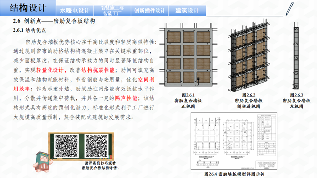 1.项目创新点一:本次大学生工业化建筑与智慧建造竞赛,依托密肋复合板结构体系,充分发挥密肋复合墙板已有的工业化生产模式、装配式建造的特点,积极赋予数字化、信息化的智慧特征,在墙板的生产、安装、质量管控等方面实现全流程的过程把控。同时,在建筑、结构、水暖电各专业的设计过程,综合利用墙板的高效保温、轻量自重、节点优化等特点进行各专业的优化设计,保证了结构安全与经济适用的双重目标。