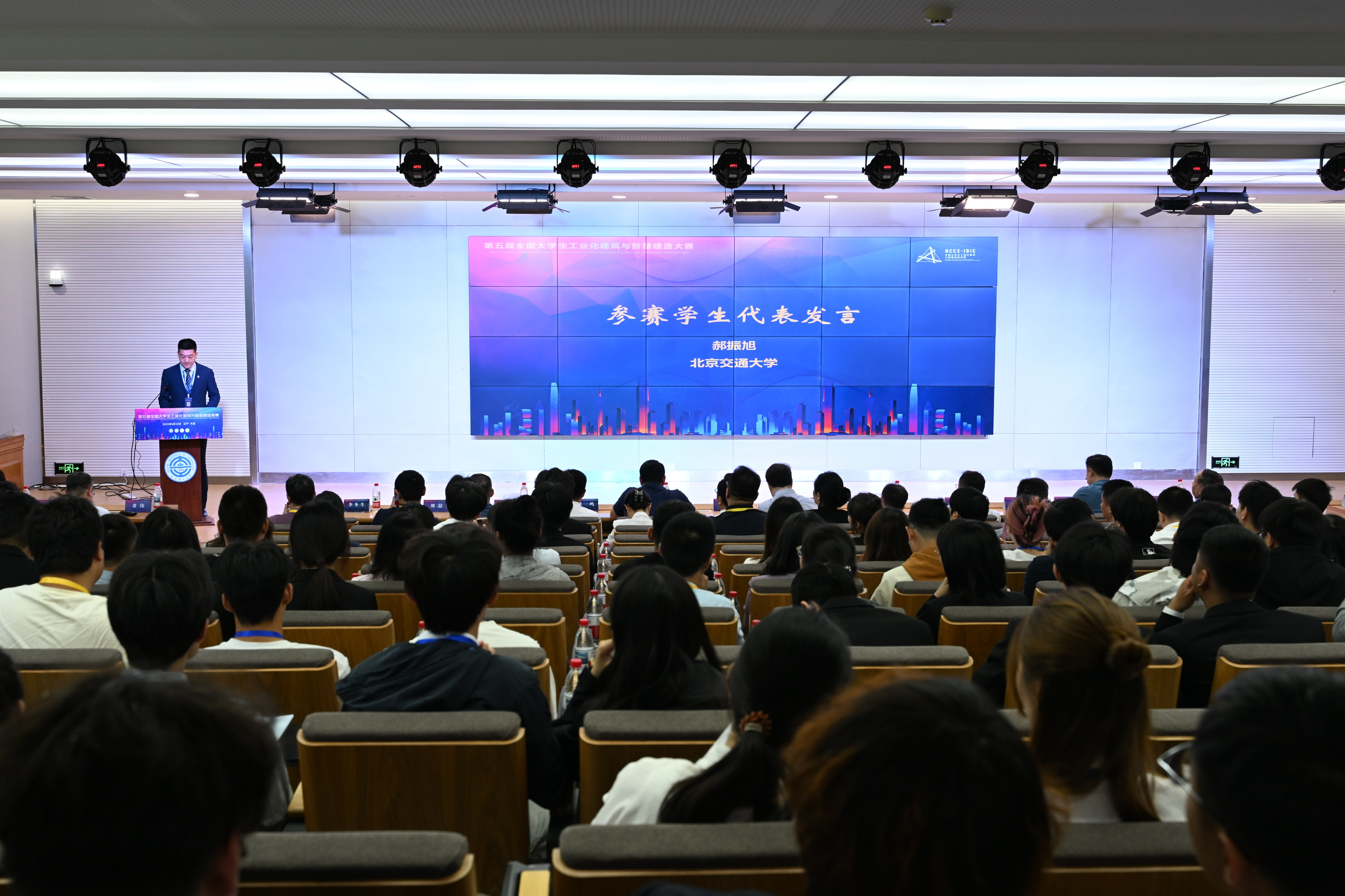 队长郝振旭同学作为参赛团队学生代表在竞赛开幕式上发言。阐述了团队秉承的“知行合一”信念和智能建造与交通设施融合创新的实践,回应了“绿色低碳、智能创新”时代召唤的实践与担当,获得了与会专家学者、现场参赛师生的一致好评,充分展示了新时代土建学子的优秀品质和良好形象。