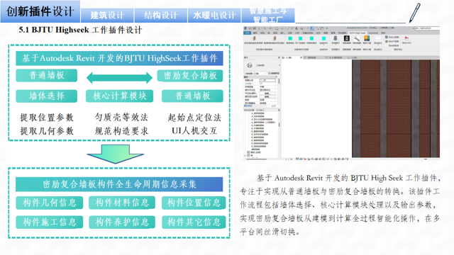 2.项目创新点二:针对大赛指定软件对于密肋复合板结构这一新型体系的不完全适用性,指导教师带领参赛同学开发了基于Auto Revit的 BJTU High Seek 工作插件,专注于实现从普通钢筋混凝土墙板与密肋复合墙板的转换。该插件工作流程包括墙体选择、核心计算模块处理以及参数输出,实现密肋复合墙板从建模到计算全过程智能化操作,在多个设计平台间顺畅切换。